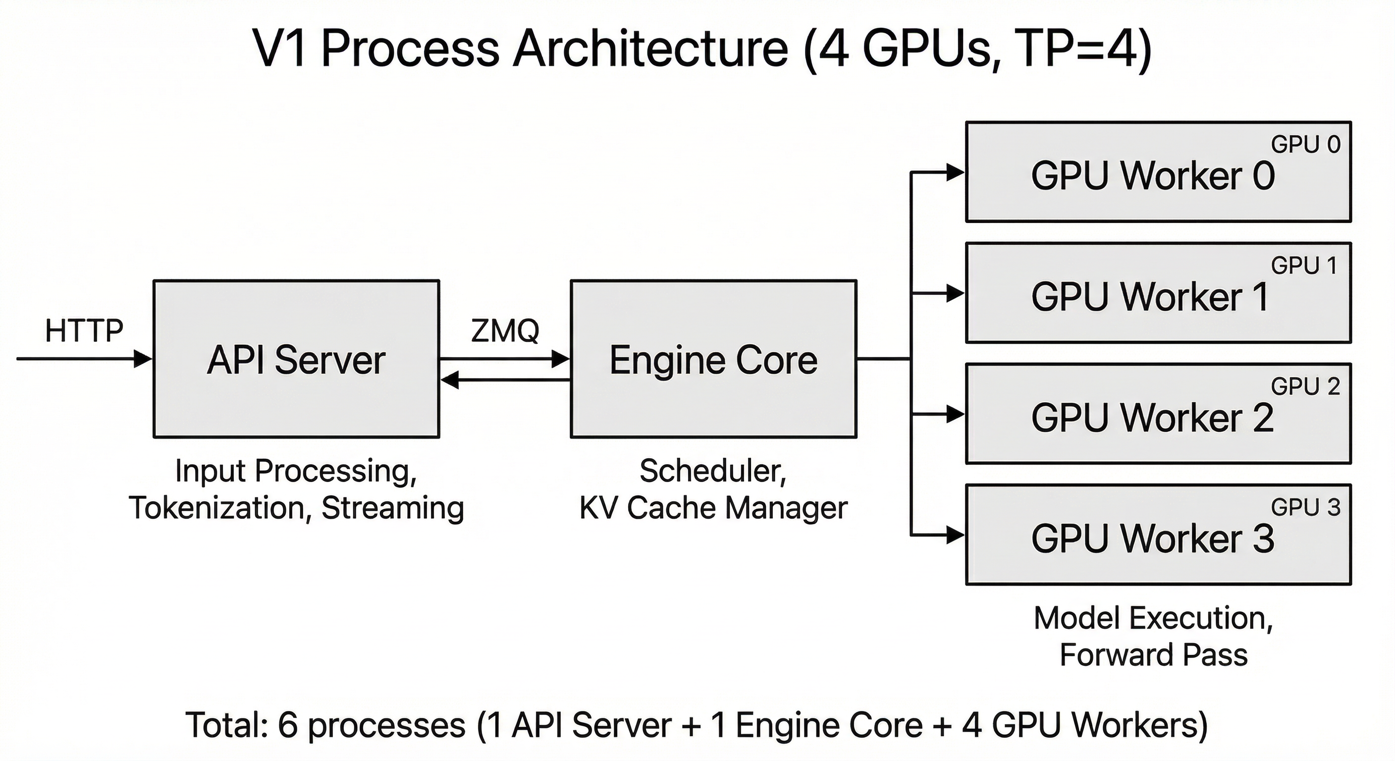 • 1 API server + 1 engine core + 4 GPU workers = 6 processes